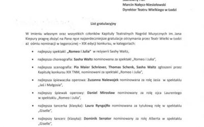 12.09.2025Dziękujemy Mazowieckiemu Teatrowi Muzycznemu im. Jana Kiepury za przesłanie nominacji w tegorocznych XIX Teatralnych Nagród Muzycznych im. Jana Kiepury!